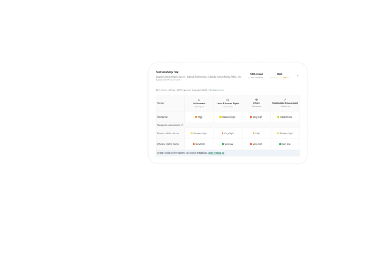 EcoVadis 的解决方案涵盖关键风险指标,例如强迫劳动、债务奴役/契约劳动、能源消耗与温室气体、消费者健康与安全等。该风险方法论与全球标准保持一致,包括 ISO、GRI、联合国全球契约(UN Global Compact)、国际劳工组织(ILO)等。